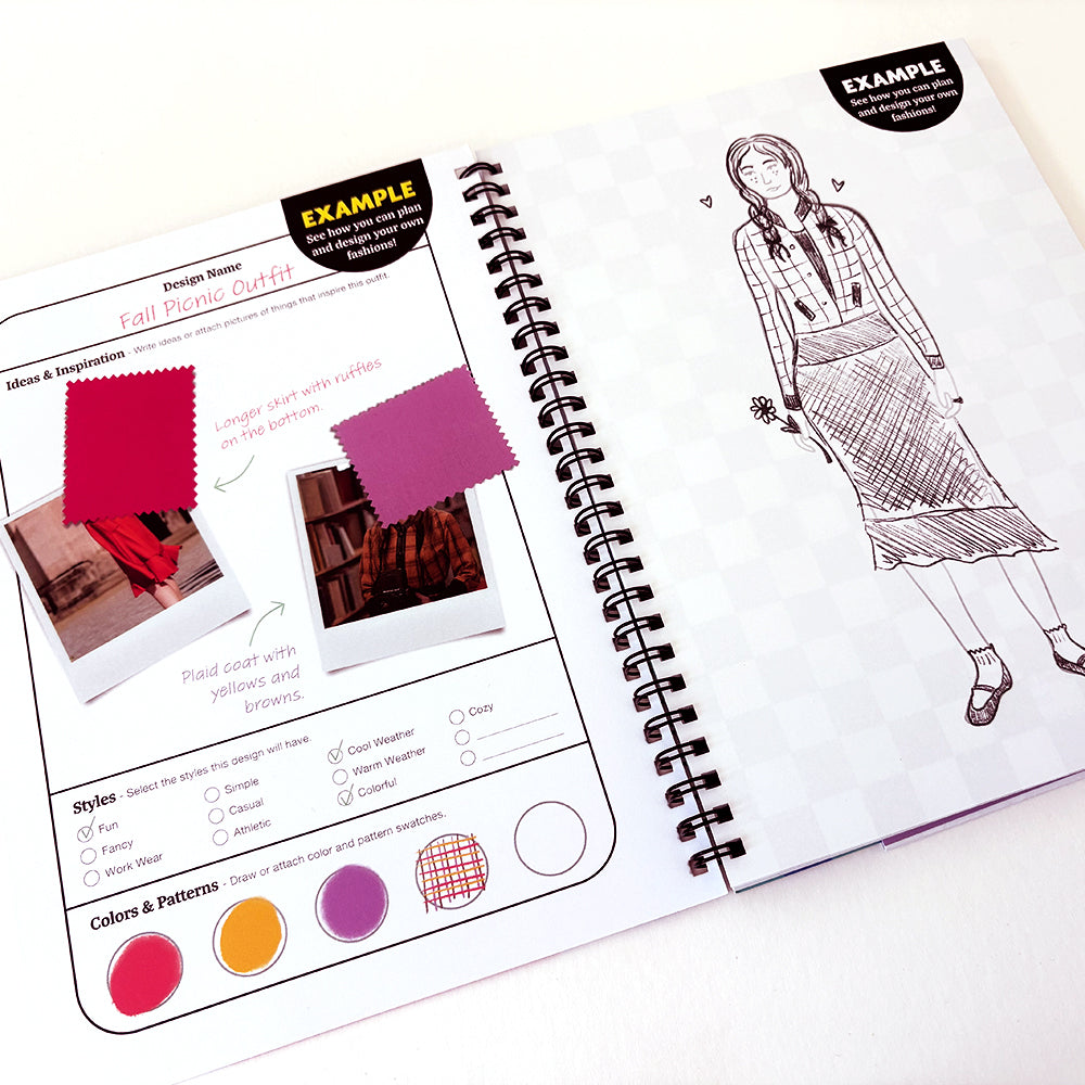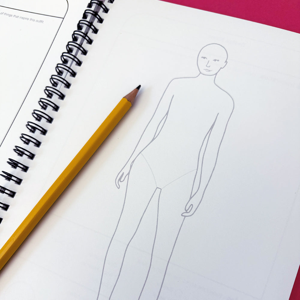 • INTERIOR: Color example showing how the journal can be used, an instructional page that describes how to find inspiration, what materials to use, plus a page full of design prompts and challenges to use throughout. The majority of the journal consists of blank fashion design model pages with sections to jot inspiration, paste clippings and develop cohesive ideas.