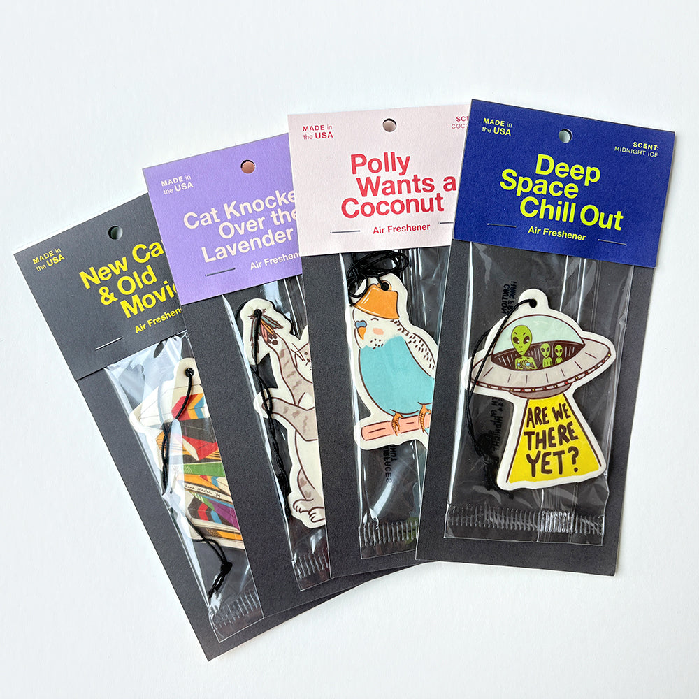 Get in, loser, we're going to the video store. This illustrated air freshener taps into the millenial nostalgia of VHS tapes and Friday night rentals. Featuring a stately New Car scent, this giftable makes a perfect add on to any birthday, co-worker or stocking gift.